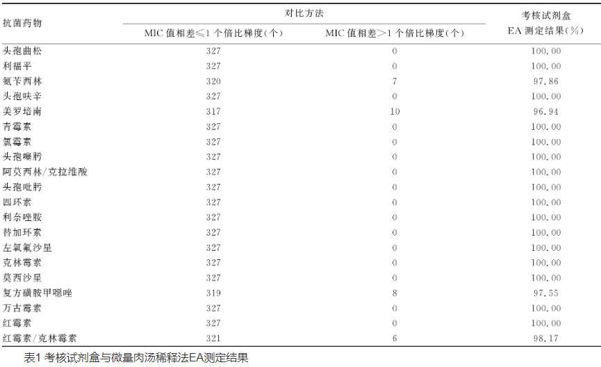 表1 考核試劑盒與微量肉湯稀釋法EA測(cè)定結(jié)果
