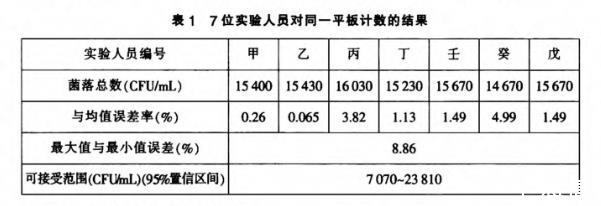 表1 7位實驗人員對同一平板計數(shù)的結(jié)果