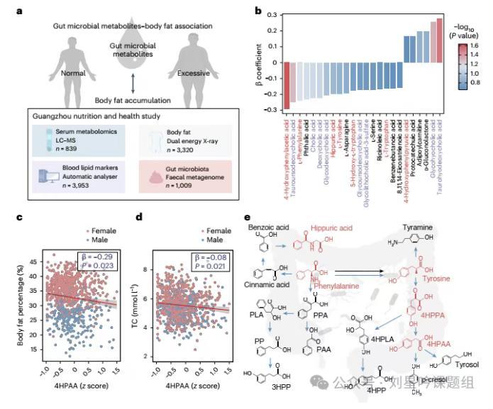 該研究基于廣州營養(yǎng)與健康研究(GNHS)隊列的數(shù)據(jù),通過評估血清中微生物相關代謝物與人體不同區(qū)域的脂肪百分比之間的關聯(lián)(圖1a),發(fā)現(xiàn)8個參與膽汁酸代謝途徑的分子和7個與AAA代謝途徑相關的分子均與脂肪堆積有關。AAA代謝途徑中的7個分子分別為:4HPAA(圖1c)、Phe、Tyr、馬尿酸、5-羥色氨酸和Trp,均與肥胖呈負相關;而4-羥基苯丙酮酸與肥胖呈正相關。進一步作者研究發(fā)現(xiàn),在排除年齡,性別,飲食等因素后,4HPAA與全身脂肪積累、總膽固醇濃度呈現(xiàn)最明顯的負相關。且作者發(fā)現(xiàn),4HPAA不僅能減少內(nèi)臟脂肪堆積,還可降低血液中總膽固醇和低密度脂蛋白LDL-C(圖1b-d)。