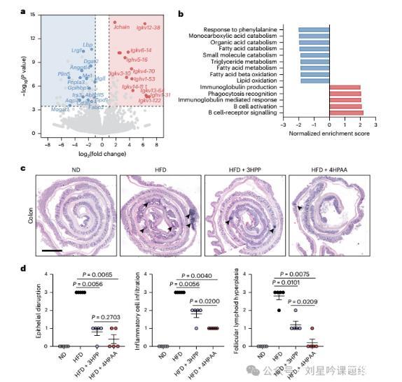 為探究AAA及其代謝物是如何作用于腸道從而發(fā)揮抗肥胖的作用,研究則將飲用4HPAA及純水的HDF引起的肥胖小鼠的腸道組織進行轉(zhuǎn)錄組學分析。結果顯示,結腸組織中有42個上調(diào)和64個下調(diào)的轉(zhuǎn)錄本?;蚣患治霰砻鲄⑴c脂質(zhì)代謝的途徑,包括單羧酸分解代謝、脂肪酸分解代謝、甘油三酯代謝、脂肪酸代謝和脂質(zhì)氧化等途徑均被抑制,編碼免疫球蛋白或B細胞信號因子相關代謝通路上調(diào)。其中參與脂質(zhì)代謝的基因Scd1,Lpl,Aqp7,Fabp2 and Cd36表達也顯著下調(diào)(圖7a-b),但是體外使用4HPAA及3HPP直接刺激小鼠腸道類器官,發(fā)現(xiàn)這些基因并未有顯著變化,故作者認為4HPAA及其衍生物不直接作用于腸上皮細胞來發(fā)揮作用。進一步作者研究發(fā)現(xiàn),4HPAA可以減少腸道炎癥細胞浸潤,恢復腸道屏障完整性(圖7 c-d)。