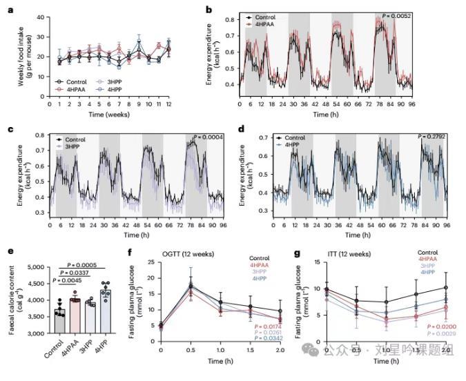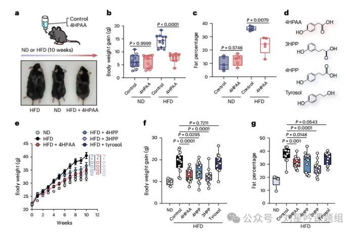 為了進一步去驗證4HPAA是否可以影響小鼠的脂肪含量,研究者將4HPAA添加到正常小鼠及高脂飲食(HDF)造成的肥胖小鼠飲水中(圖2a)。結果顯示,4HPAA可以顯著抑制了HFD小鼠體重和脂肪百分比的增加(圖2b-c)。為了進一步去驗證4HAPP的羥基化合物是否也有類似的功能,作者給正常小鼠及HDF飲食造成的肥胖小鼠飲用4HPP、3HPP和Tyrosol,結果顯示與4HPAA結構相關的代謝產(chǎn)物4HPP和3HPP也展現(xiàn)出類似的抗肥胖作用(圖2e-g)。