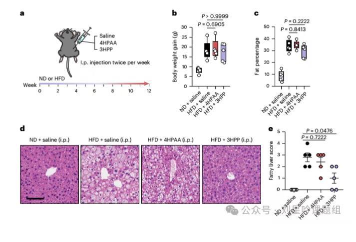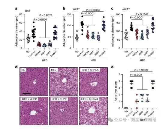 為了觀察4HPAA對脂肪組織形態(tài)的改變,作者對多種脂肪組織進行HE染色。結果顯示,4HPAA、3HPP、4HPP可抑制HFD喂養(yǎng)小鼠的肩胛骨間棕色脂肪組織(iBAT)、腹股溝白色脂肪組織(iWAT)和附睪白色脂肪組織(eWAT)中的脂肪細胞肥大(圖3a-c)。已知HDF飲食造成的肥胖往往伴隨著肝脂肪性病變,作者的進一步研究發(fā)現(xiàn),4HPAA、3HPP、4HPP不僅可以抑制脂肪細胞肥大,也能抑制肝脂肪性病變。以上結果表明4HPAA及其結構類似物可改善肥胖小鼠的脂肪細胞肥大和肝臟組織脂肪變性。