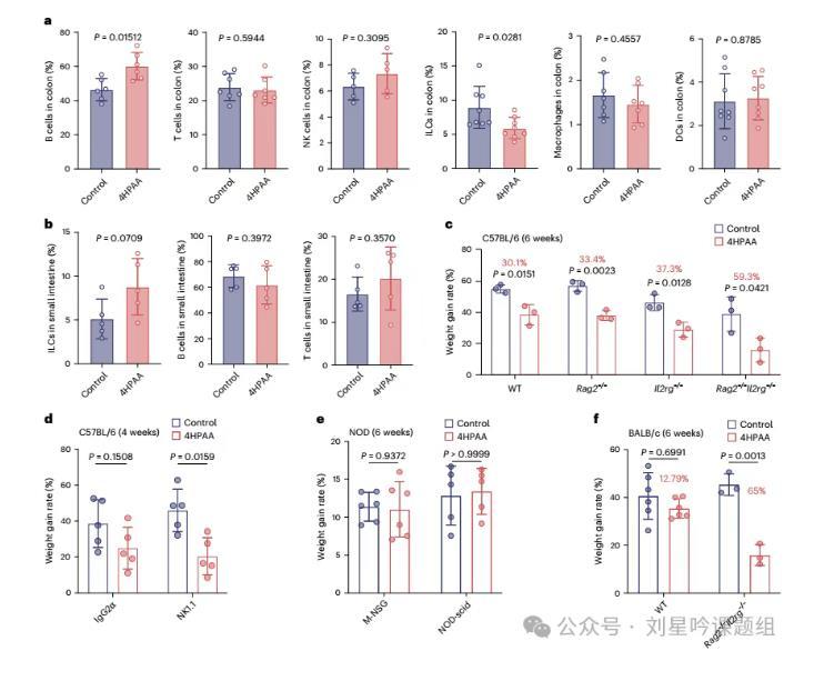 為進一步探究4HPAA對腸道免疫細胞的影響,研究者分析了小鼠結腸及小腸中的各類免疫細胞組成。結果發(fā)現(xiàn)將4HPAA干預后小鼠結腸中ILCs細胞減少,而在小腸中少量增加(圖8a,b)。為了進一步研究4HPAA是否通過免疫調(diào)節(jié)減輕了HFD誘導的體重增加,研究者使用了多種免疫缺陷的小鼠模型,結果顯示ILCs及NK細胞在4HPAA誘導的抗肥胖作用中發(fā)揮著重要的抑制4HPAA的作用(圖8c)。進一步研究者通過使用IgG2α對照或抗NK1.1抗體,以耗盡NK和ILC1細胞進一步證實這一猜想(圖8d)。最后,研究者發(fā)現(xiàn)不同背景的小鼠對4HPAA的敏感性不同(圖8e,f)。