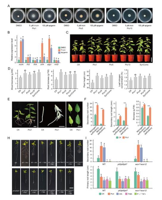 圖1:tricin和apigenin合同通路招募的假單胞菌促進(jìn)了楊樹(shù)的氮利用和次生根生長(zhǎng)