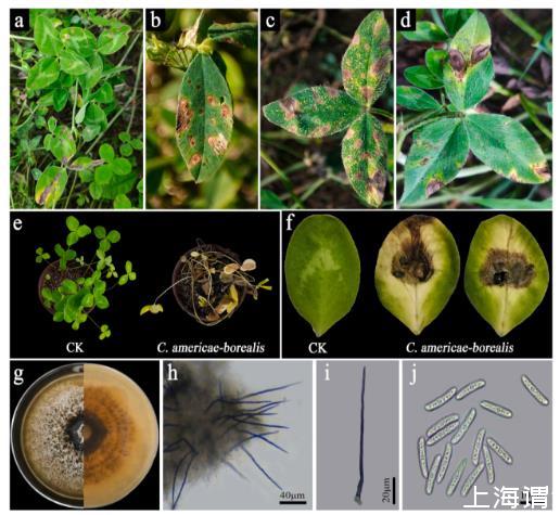 圖1:由Colletotrichum americae-borealis引起的紅三葉草炭疽病癥狀及C.americae-borealis的形態(tài)特征