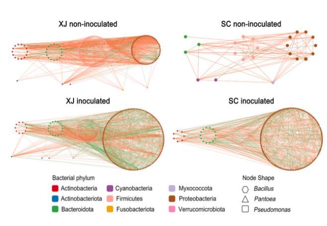 圖4:XJ和SC材料葉際微生物共現(xiàn)網(wǎng)絡(luò)