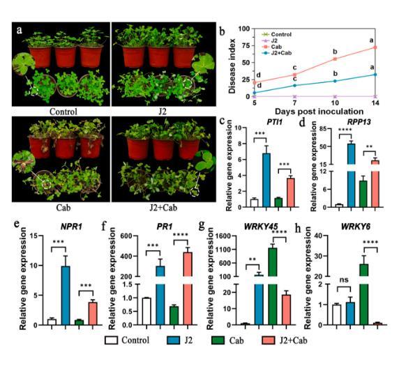 為了驗(yàn)證J2對(duì)植物防御機(jī)制的影響,研究進(jìn)行了溫室實(shí)驗(yàn),預(yù)處理易感材料SC后再接種Cab。分別在接種后的第5、7、10和14天監(jiān)測(cè)病情指數(shù),并收集葉片樣本用于RNA提取。qRT-PCR結(jié)果顯示,J2顯著上調(diào)了多個(gè)關(guān)鍵防御相關(guān)基因(如RPP13、PTI1、NPR1、PR1等)的表達(dá)水平(圖6),說(shuō)明J2通過(guò)激活植物免疫系統(tǒng)增強(qiáng)了抗病性。