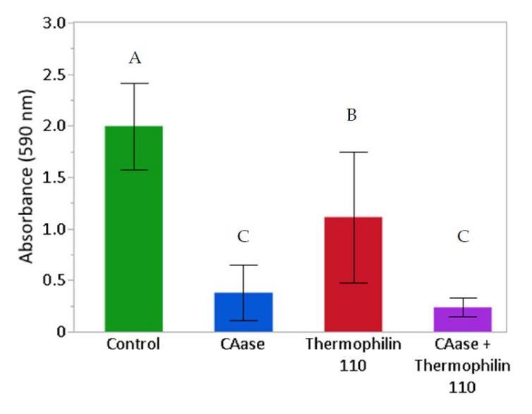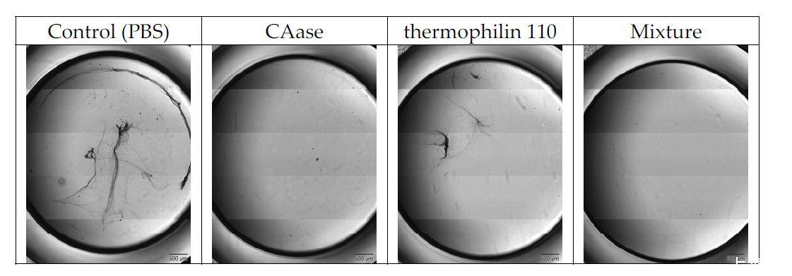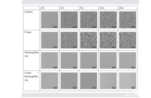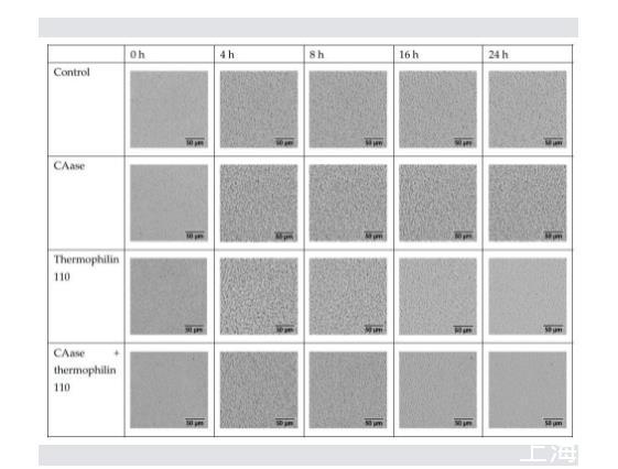 圖1、處理后單核細(xì)胞增生李斯特菌生物膜的圖像。這些圖像描繪了過夜處理后的成熟生物膜,如下所示:對(duì)照-PBS,CAase-0.1 mg/mL CAase,嗜熱素110–1000 AU/mL嗜熱素110,混合物—0.1 mg/mL CAase和1000 AU/mL嗜熱蛋白110的混合物
