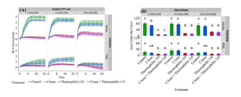 使用oCelloscope微生物動(dòng)態(tài)監(jiān)測(cè)系統(tǒng)監(jiān)測(cè)不同處理?xiàng)l件下李斯特菌的生長情況。在LB肉湯或PBS緩沖液中分別加入CAase、嗜熱蛋白110或其混合溶液。將96孔板加載到oCelloScope中并在30°C下培養(yǎng)25小時(shí)。使用oCelloscope UniExplorer(v.12.0)使用帶有BCA(背景校正吸收)分析算法的生長動(dòng)力學(xué)模塊每30分鐘采集10張圖像/孔。OCS UniExplorer軟件V12報(bào)告的BCA值作為時(shí)間的函數(shù)在JMP中制成表格,并生成圖表。通過背景校正吸收(BCAN)算法分析圖像,并計(jì)算生長曲線下的面積,以評(píng)估處理對(duì)細(xì)菌生長的影響。