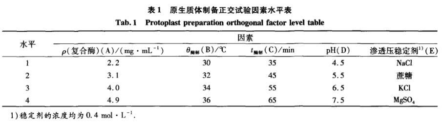 表1原生質(zhì)體制備正交試驗(yàn)因素水平表