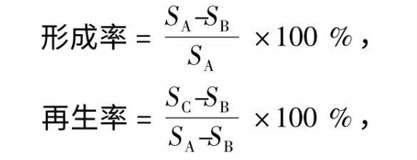 式中,SA、SB、SC分別為PDA培養(yǎng)基、低滲培養(yǎng)基、雙層再生培養(yǎng)基上的菌落面積(cm2)。