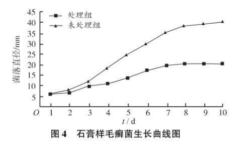 結(jié)果見圖3,4。從圖3中可以看出樣品對(duì)金黃色葡萄球菌生長曲線影響非常明顯,CK曲線6 h前是延滯期,6~14 h是指數(shù)期,14~20 h是穩(wěn)定期,處理組沒有達(dá)到正常的生長高峰,8 h后就進(jìn)入衰亡期,從曲線可以推斷藥物主要抑制菌的指數(shù)期。圖4中CK生長曲線顯示3~7 d石膏樣毛癬菌出現(xiàn)了快速生長,7 d以后緩慢生長處于穩(wěn)定期,而藥物處理后菌的生長速度明顯減慢,對(duì)菌的每個(gè)生長期都有不同程度的抑制。