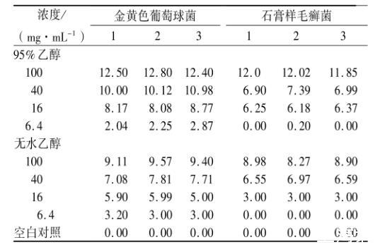 表1 95%乙醇和無水乙醇提取物對(duì)金黃色葡萄球菌和石膏樣毛癬菌的抑菌圈直徑