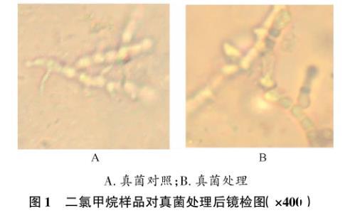 結(jié)果見圖1,2。圖1A可以看出石膏樣毛癬菌對(duì)照組菌絲分支均勻,節(jié)與節(jié)之間連接緊密,而圖1B處理組的菌絲分支扭曲混亂,節(jié)與節(jié)之間間距大,許多還有脫節(jié)現(xiàn)象,頂端有異常分支及膨大。圖2A可以看出金黃色葡萄球菌對(duì)照組菌外表光滑,呈球型串珠狀,而圖2B處理組中菌體間完全粘連在一起呈麻繩狀,菌體扭曲變形呈現(xiàn)不規(guī)則形狀,完全看不出是什么菌種。