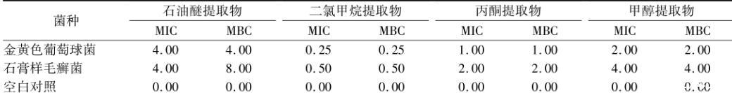 表2 4種萃取物對(duì)金黃色葡萄球菌和石膏毛癬菌的MIC、MBC