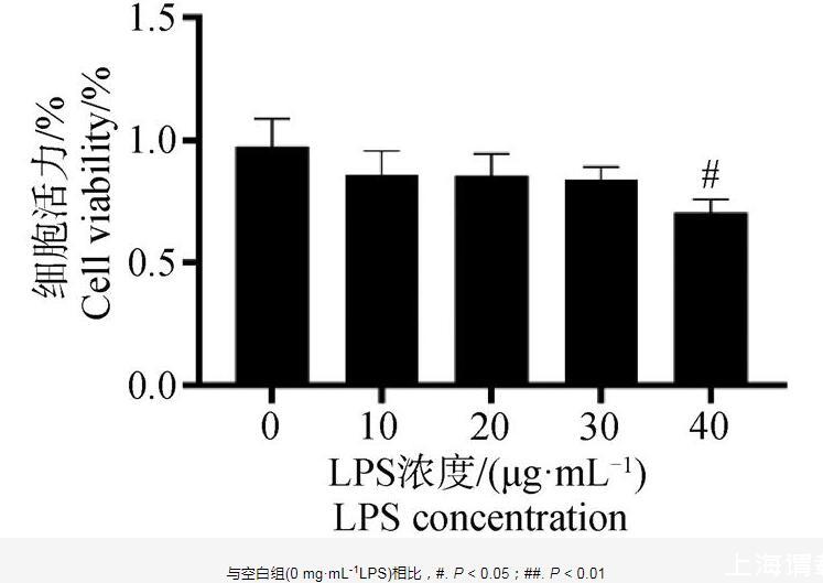 CCK-8結(jié)果如圖5所示,當(dāng)LPS濃度在40μg·mL-1時(shí),細(xì)胞存活率顯著下降(P<0.05)。因此,本試驗(yàn)選擇40μg·mL-1作為L(zhǎng)PS誘導(dǎo)DF-1細(xì)胞損傷模型的染毒劑量。