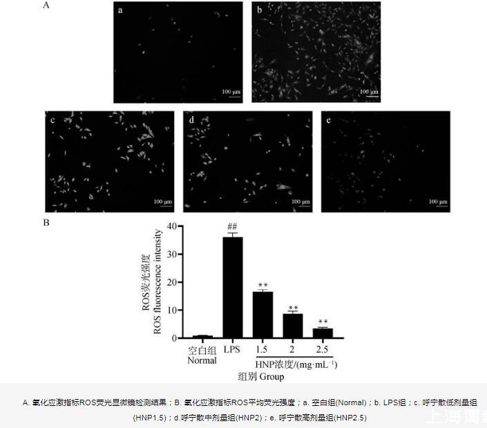 A.氧化應(yīng)激指標(biāo)ROS熒光顯微鏡檢測(cè)結(jié)果;B.氧化應(yīng)激指標(biāo)ROS平均熒光強(qiáng)度;a.空白組(Normal);b.LPS組;c.呼寧散低劑量組(HNP1.5);d.呼寧散中劑量組(HNP2);e.呼寧散高劑量組(HNP2.5)