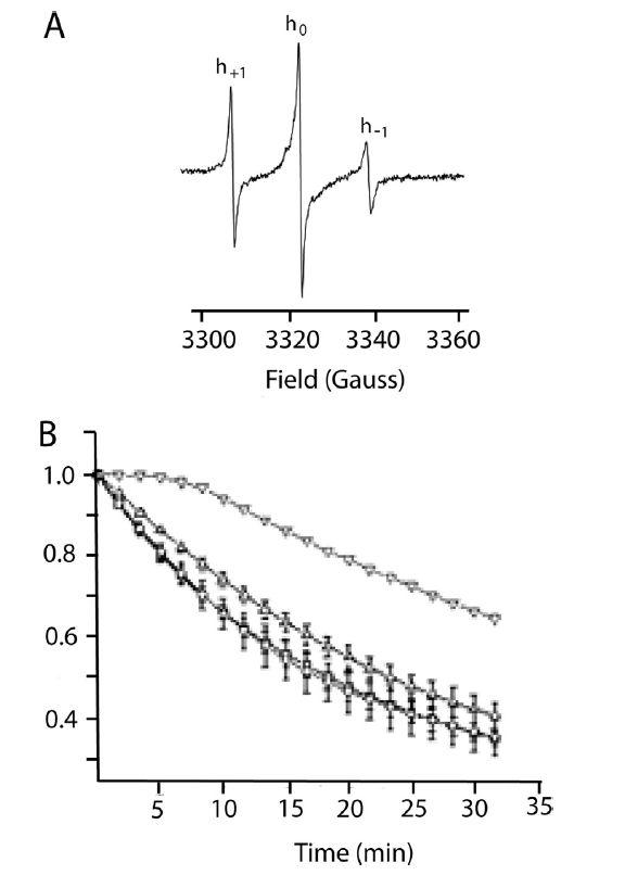 圖3、PDT的減少表明黑曲霉2、5和8日齡分生孢子的代謝活性。(A)在分生孢子存在下,t=0(上層)和t=30 min(下層)時1 mM PDT的ESR譜圖。高場(右)線(H)的高度用于量化PDT。(B)Hheight在2日齡(正方形)、5日(圓)和8(三角形)分生孢子中的減少。使用熱滅活2日齡的分生孢子作為對照(三角形O)。誤差線代表生物重復(fù)的標(biāo)準(zhǔn)差,r.u.是相對單位。