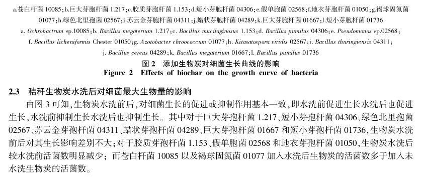 結(jié)果表明,秸稈生物炭對不同的細菌的生長影響不同,對于部分細菌存在明顯生長促進作用,其中對膠質(zhì)芽孢桿菌1.217的促進作用最明顯,培養(yǎng)12h后其最大生長量可提高3.6倍;對于巨大芽孢桿菌1.217、短小芽孢桿菌04306以及褐球固氮菌01077,加入生物炭培養(yǎng)14~20h后最大生長量可提高1.5倍左右;巨大芽胞桿菌01667加入生物炭培養(yǎng)12h后,其最大生長量也可提高1.3倍;而對于另外一部分細菌,生物炭對其生長基本沒有影響或有較小的抑制作用。