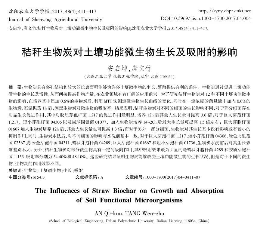 秸稈生物炭對土壤功能微生物生長及吸附的影響