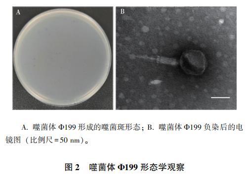 (圖2:A.噬菌體Φ199形成的噬菌斑形態(tài);B.噬菌體Φ199負(fù)染后的電鏡圖(比例尺=50 nm))