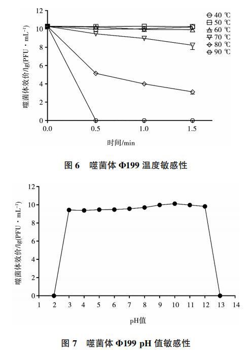 如圖6所示,在40~60℃時(shí)噬菌體Φ199能夠穩(wěn)定存在,在70、80℃時(shí)噬菌體效價(jià)在1.5 h內(nèi)急劇下降,在90℃孵育30 min后噬菌體效價(jià)降低至0。以上結(jié)果表明,噬菌體Φ199在40~60℃范圍內(nèi)活性比較穩(wěn)定,在70℃及以上溫度下較難長(zhǎng)時(shí)間生存。