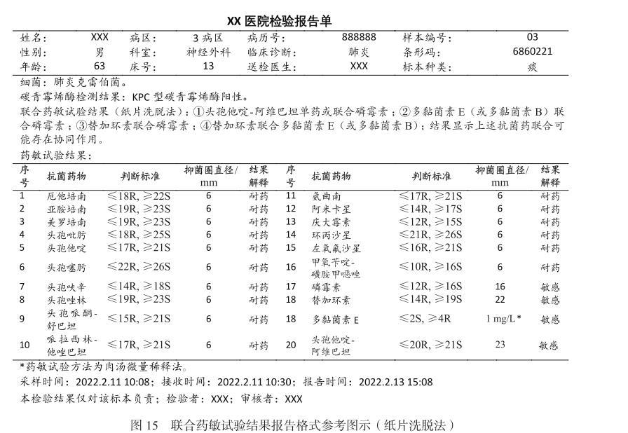 圖15聯(lián)合藥敏試驗結(jié)果報告格式參考圖示(紙片洗脫法)