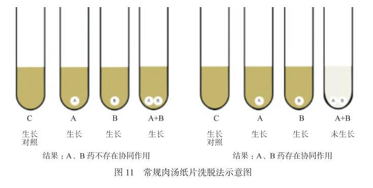 ①常規(guī)肉湯紙片洗脫法:此方法為兩種不同抗菌藥物的聯(lián)合。實驗時在4根無菌試管中分別加入2 mL的CAMHB肉湯,分別標(biāo)記為C、A、B和A+B管,其中C管為生長對照,A管放入1張抗菌藥物A藥敏紙片,B管放入1張抗菌藥物B藥敏紙片,A+B管同時放入抗菌藥物A和抗菌藥物B藥敏紙片,輕輕渦旋30 s,室溫(23±2)℃孵育至少30 min使紙片中的抗菌藥物完全擴(kuò)散入肉湯中(不可超過60 min)(參考CLSI黏菌素肉湯紙片洗脫試驗)[35]。然后準(zhǔn)備0.5麥?zhǔn)蠞岫却郎y菌菌懸液,用移液器分別在在C、A、B和A+B管中加入10μL的0.5麥?zhǔn)蠞岫却郎y菌菌懸液,最終接種菌量為7.5×105CFU/mL,35℃孵育16~20 h后觀察各管中的細(xì)菌生長情況(圖11)。注意:本方法每試管中肉湯的體積需按每片藥敏紙片中所含抗菌藥物的量和該菌對該抗菌藥物的耐藥判斷標(biāo)準(zhǔn)而定,溶液中抗菌藥物最終濃度應(yīng)≥中介標(biāo)準(zhǔn)。如該菌對抗菌藥物的耐藥標(biāo)準(zhǔn)為≥16 mg/L,藥敏紙片中所含抗菌藥物的量為30μg/片,則每管中CAMHB肉湯的含量應(yīng)為2 mL。以紙片中抗菌藥物完全溶解入肉湯中計算,2 mL肉湯中該抗菌藥物的濃度為15 mg/L(近似于耐藥標(biāo)準(zhǔn))。