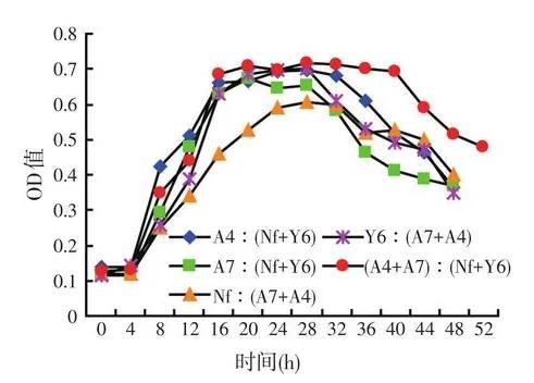 由圖2可知,5組試驗(yàn)組達(dá)到穩(wěn)定期的時(shí)間都比單獨(dú)混合菌短,都在16~20 h之間,其中[(A4+A7)∶(Nf+Y6)]的穩(wěn)定期時(shí)間為16 h。