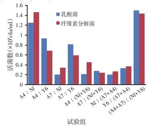 混合培養(yǎng)后活菌數(shù)見圖3。在圖3中可看出,乳酸菌活菌數(shù)在A4∶Nf、A7∶Y6、A4∶Y6、(A4+A7)∶(Nf+Y6)試驗(yàn)組中都較高,而纖維素分解菌在A4∶Nf、A7∶Y6、(A4+A7)∶(Nf+Y6)試驗(yàn)組中較高。兩者均高的有A4∶Nf和(A4+A7)∶(Nf+Y6)試驗(yàn)組,其中(A4+A7)∶(Nf+Y6)試驗(yàn)組的最好。