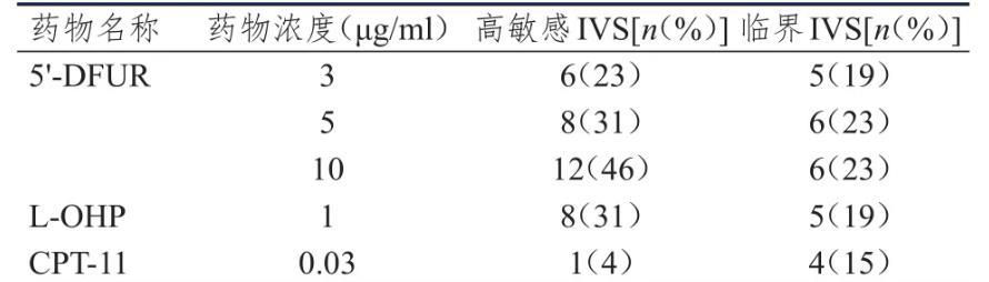 31例新鮮胃癌組織標(biāo)本中,26例可評(píng)價(jià),檢測(cè)成功率為84%(26/31),5例檢測(cè)失敗原因?yàn)槟[瘤細(xì)胞含量低,生長(zhǎng)率低于0.8。檢測(cè)成功的26例中,隨著5'-DFUR濃度(3、5、10μg/ml)的增加,體外有效率(in vitro sensitivity,IVS)也呈增長(zhǎng)趨勢(shì),高敏感IVS分別為23%、31%和46%(表2),由于已報(bào)道CAP單藥的胃癌臨床有效率約為30%,因此,本研究結(jié)果表明,胃癌體外藥敏實(shí)驗(yàn)中,5μg/ml的5'-DFUR為CAP體外藥敏檢測(cè)CD-DST法的最適實(shí)驗(yàn)條件。