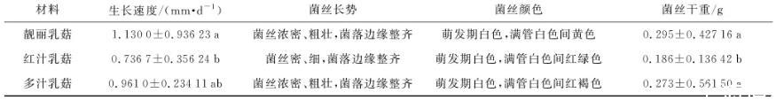 表1不同松乳菇菌株母種菌絲的生長情況比較