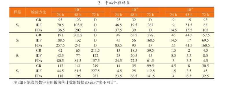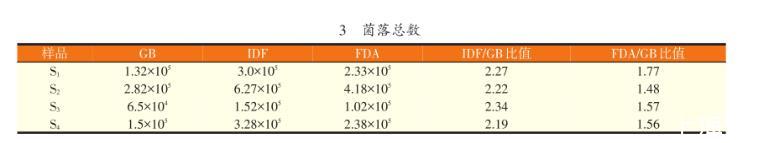 對表3結(jié)果進(jìn)行比較分析,IDF 100A:1987檢出率顯著高于GB/T 4789.2—2010和FDA BAM—2001方法,IDF 100A:1987檢出率為GB/T 4789.2—2010的2.2倍左右,F(xiàn)DA BAM—2001檢出率大約為GB/T 4789.2—2010檢出率的1.5倍左右。