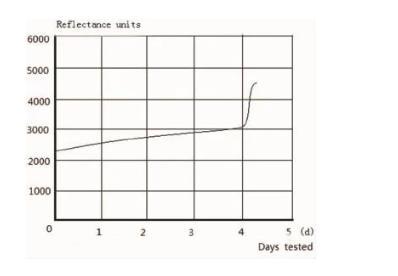 腸桿菌科報陽時間最短,而生長曲線的遲緩期短,對數(shù)期十分迅速,平穩(wěn)期極短,有時甚至看不到并且其二氧化碳的絕對濃度都在4000反射光度以上。其形成上述特點是由于此類細菌一般為兼性厭氧,在對營養(yǎng)條件要求不高,生長期短,細菌繁殖快,發(fā)酵葡萄糖產(chǎn)酸且產(chǎn)氣,二氧化碳產(chǎn)生速度快而量多[3]。這些報陽的腸桿菌科細菌中有一例特別的生長曲線見圖二,雖然這例五天報陽時間,但是其對數(shù)期十分迅速。出現(xiàn)這種生長曲線的原因是患者在抽血培養(yǎng)前就使用過抗生素。
