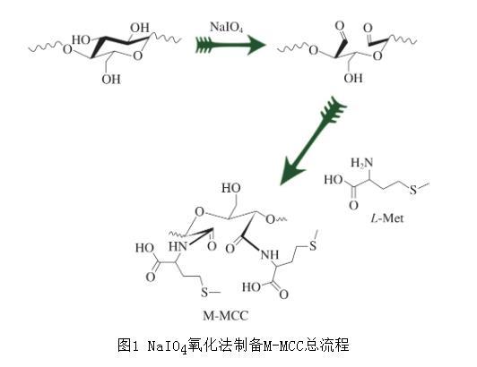 稱取10 g上述所得DAC,根據(jù)DAC與所用L-Met物質(zhì)的量比為1∶1稱取L-Met,并將二者混合在250 mL去離子水中,在40℃、400 r/min的條件下攪拌混勻5 min后加入5 mL二甲基亞砜,并繼續(xù)攪拌反應(yīng)6 h。然后加入5 g硼氫化鈉(NaBH4),靜置至無氣泡產(chǎn)生后,加入6 mL無水乙醇終止反應(yīng)。使用去離子水洗滌所得產(chǎn)物2~3次后,將所得產(chǎn)物轉(zhuǎn)移至透析袋用去離子水透析48 h,期間每8 h更換去離子水,以除去產(chǎn)物中摻雜的過量離子。最后冷凍干燥得到最終產(chǎn)物M-MCC。