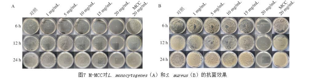 圖7 M-MCC對(duì)L.monocytogenes(A)和S.aureus(B)的抗菌效果