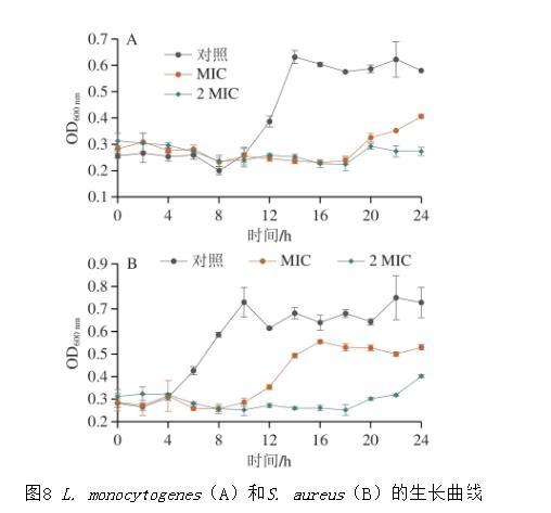 圖8 L.monocytogenes(A)和S.aureus(B)的生長(zhǎng)曲線