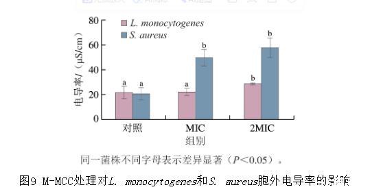 圖9 M-MCC處理對L.monocytogenes和S.aureus胞外電導率的影響