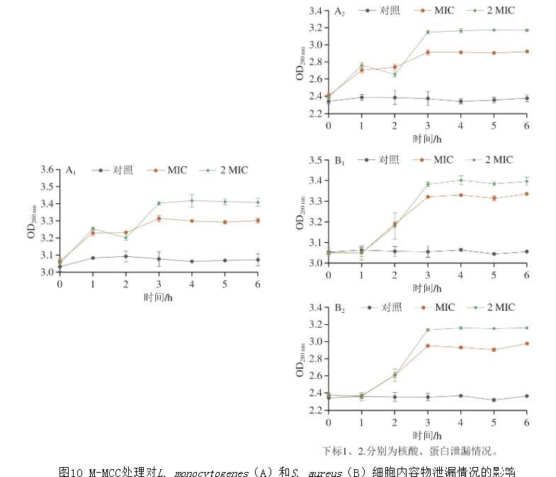 圖10 M-MCC處理對L.monocytogenes(A)和S.aureus(B)細胞內(nèi)容物泄漏情況的影響