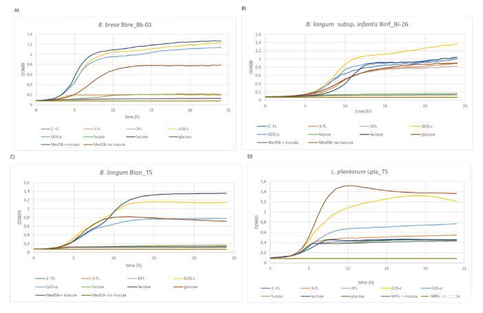 圖3、(A)雙歧桿菌B.breve Bbre_Bb03、(B)雙歧桿菌B.longum subsp.infantis Bi-26(C)雙歧桿菌B.longum Blon_TS、(D)雙歧桿菌L.plantarum Lpla_TS在不同碳源下的生長情況(2'-巖藻糖基乳糖(2'-FL)、3-巖藻糖基乳糖(3-FL)、二巖藻糖基乳糖(DFL)、巖藻糖(Fuc)、商業(yè)半乳糖寡糖(GOS-c)、富含寡糖的GOS(GOS-p)、乳糖(Lac)和葡萄糖(Glu)。