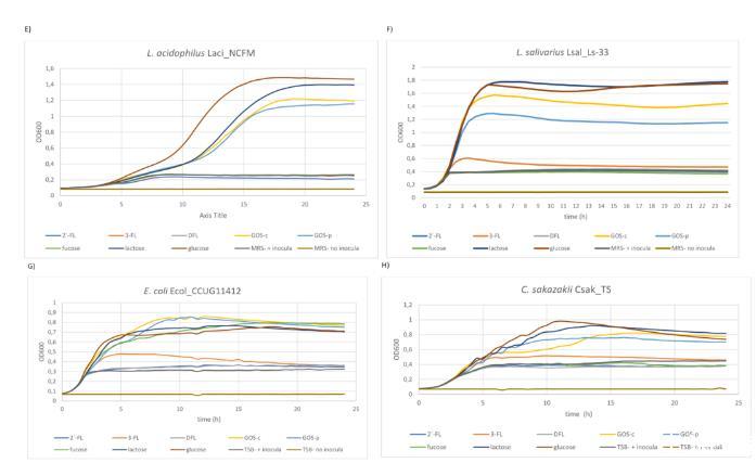 圖4、(E)乳酸桿菌NCFM(F)唾液乳桿菌Ls-33(G)大腸桿菌Ecol_CCUG11412、(H)植物乳桿菌型Csak_TS在不同碳源下的生長情況(2'-巖藻糖基乳糖(2'-FL)、3-巖藻糖基乳糖(3-FL)、二巖藻糖基乳糖(DFL)、巖藻糖(Fuc)、商業(yè)半乳糖寡糖(GOS-c)、富含寡糖的GOS(GOS-p)、乳糖(Lac)和葡萄糖(Glu)。