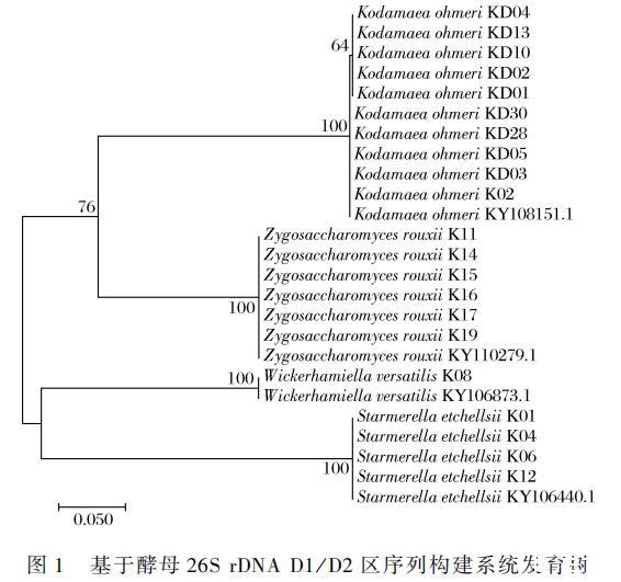 由于柯達(dá)酵母屬在醬油發(fā)酵的3~4月占比最高,因此選擇發(fā)酵3~4月的高鹽稀態(tài)醬醪醪采樣,一共分離得到21株純培養(yǎng)酵母菌株,其形態(tài)特征及豆芽汁發(fā)酵液嗅聞結(jié)果如表1所示。21株酵母的豆芽汁發(fā)酵液具有花果香、酒香、醇香等香氣特征。對(duì)所分離的生香酵母進(jìn)行26S rDNA D1/D2區(qū)測(cè)序并構(gòu)建系統(tǒng)發(fā)育樹。如圖1所示,共獲得4個(gè)種,分屬4個(gè)屬,柯達(dá)酵母數(shù)量最多(10株),且均為K.ohmeri,其余為魯氏接合酵母(Zygosaccharomyces rouxii)(6株)、埃切假絲酵母(Starmerella etchellsii)(4株)、多變擬威克酵母(Wickerhamiella versatilis)(1株)。