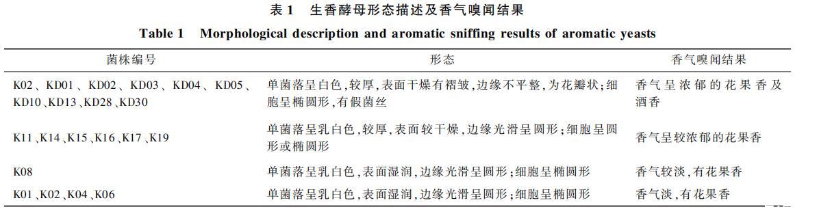 K02、KD01、KD02、KD03、KD04、KD05、KD10、KD13、KD28、KD30單菌落呈白色,較厚,表面干燥有褶皺,邊緣不平整,為花瓣?duì)?;?xì)胞呈橢圓形,有假菌絲香氣呈濃郁的花果香及酒香
