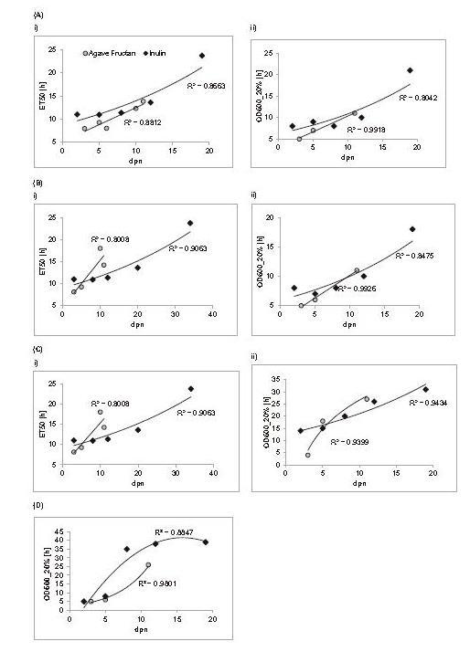 圖4。聚合度(dp n)與生長促進(jìn)的相關(guān)性:(A)嗜酸乳桿菌,(B)副干酪乳桿菌。副干酪乳桿菌CRL431,(C)鼠李糖乳桿菌GG和(D)副干酪乳桿菌ssp和副干酪乳桿菌DSM 20312(i)聚合度(dp n)和ET 50的相關(guān)性;(ii)果糖存在下dp n與最大OD 600值增加20%的時間相關(guān)性?;疑珗A圈代表龍舌蘭果聚糖,黑色菱形代表菊粉果類型的果聚糖。