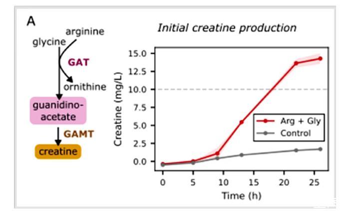 經(jīng)過(guò)多次設(shè)計(jì)-構(gòu)建-測(cè)試-學(xué)習(xí)的進(jìn)化與選擇循環(huán),與對(duì)照菌株相比,從甘氨酸和精氨酸合成的肌酸產(chǎn)量提高了58%。脊椎動(dòng)物中肌酸由精氨酸和甘氨酸經(jīng)兩步酶促反應(yīng)合成,即甘氨酸脒基轉(zhuǎn)移酶(GAT)將兩者轉(zhuǎn)化為鳥(niǎo)氨酸和胍基乙酸(GAA),胍基乙酸甲基轉(zhuǎn)移酶(GAMT)利用輔因子S-腺苷甲硫氨酸(SAM)將GAA甲基化生成肌酸。研究團(tuán)隊(duì)在大腸桿菌中組裝了該途徑,篩選并密碼子優(yōu)化了8種GAT和4種GAMT酶,發(fā)現(xiàn)GAT8與GAMT4組合的生產(chǎn)效果最佳。