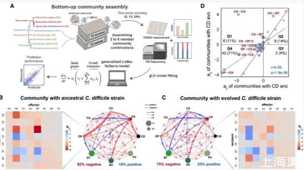 (B和C)7種腸道微生物與祖先(B)和進(jìn)化(C)艱難梭菌株之間的推斷種間交互網(wǎng)絡(luò)。節(jié)點(diǎn)大小代表各物種的載體容量,邊的寬度表示種間交互系數(shù)(aij)的大小。熱圖顯示了社區(qū)中8種物種之間的aij。