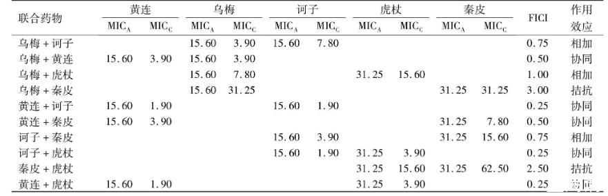 5種中藥提取物兩兩聯(lián)合的抑菌活性結(jié)果見(jiàn)表2,根據(jù)聯(lián)合抑菌指數(shù)(FICI)評(píng)價(jià)兩者的聯(lián)合效應(yīng).從表2可以看出,烏梅和秦皮、秦皮和虎杖FICI>2.00,為拮抗作用;烏梅和黃連、黃連和訶子、黃連和秦皮、訶子和虎杖及黃連和虎杖FICI≤0.50,為協(xié)同作用;烏梅和訶子、烏梅和虎杖、訶子和秦皮0.50<FICI≤1.00,為相加作用.