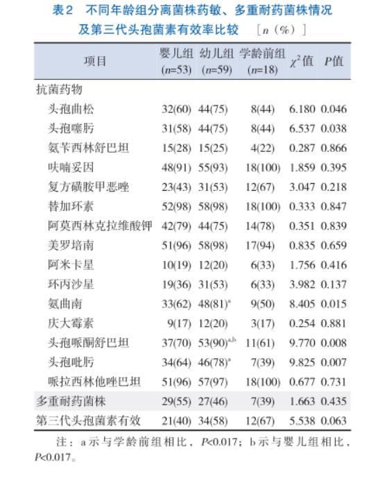表2不同年齡組分離菌株藥敏、多重耐藥菌株情況及第三代頭孢菌素有效率比較[n(%)]