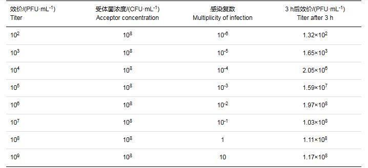 為檢測(cè)噬菌體P1最佳感染復(fù)數(shù),噬菌體和受體菌共培養(yǎng)后通過(guò)噬菌斑計(jì)數(shù)試驗(yàn)檢測(cè)。結(jié)果如表1所示,當(dāng)P1-CT噬菌體-質(zhì)粒和受體菌比例為0.01時(shí),為最佳感染復(fù)數(shù),可產(chǎn)生最多的噬菌體子代,噬菌體效價(jià)為1.97×108 PFU·mL-1。隨著MOI值的降低,噬菌體效價(jià)值呈現(xiàn)明顯下降,而隨著MOI值的增大,噬菌體效價(jià)變化幅度較小,均維持在108 PFU·mL-1水平。