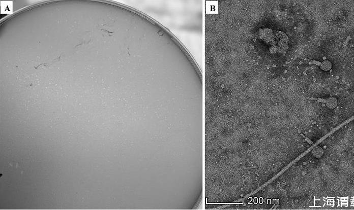 A.P1-CTX噬菌斑;B.透射電子顯微鏡下P1-CTX噬菌體形態(tài)